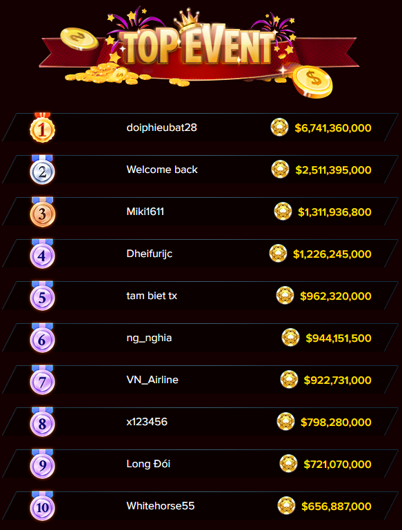 Đường đua Top của sự kiên Cao Thủ vẫn đang hừng hực lửa, và Top 1 hiện tại đang thuộc về "tay đua" doiphieubat28 với số Gold cao chót vót $6,741,360,000, và theo sau là Top 2 với số Gold gần sát nút là tài khoản Welcome back.